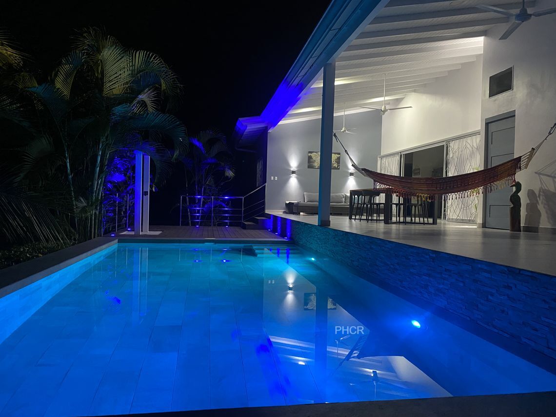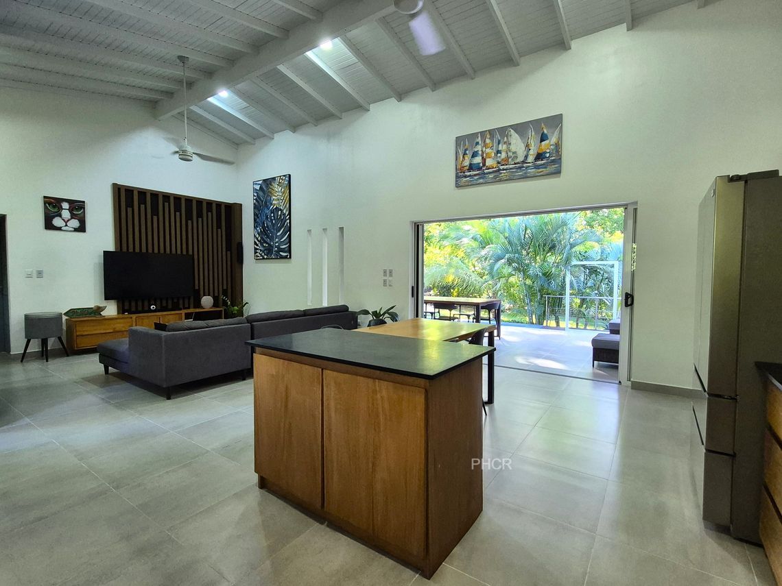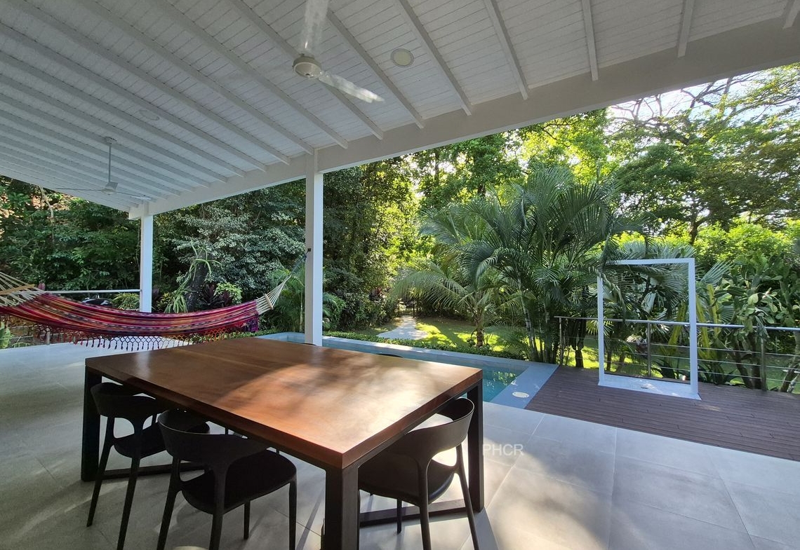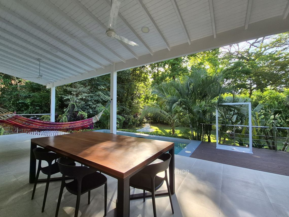 Conçue comme un véritable espace de détente, la terrasse couverte invite à de longs repas en plein air et à des moments de relaxation avec vue sur le jardin. La piscine et la terrasse se fondent harmonieusement dans le paysage tropical qui descend jusqu’à la rivière Buena Vista, garantissant une intimité absolue et la possibilité d’observer quotidiennement la faune locale.