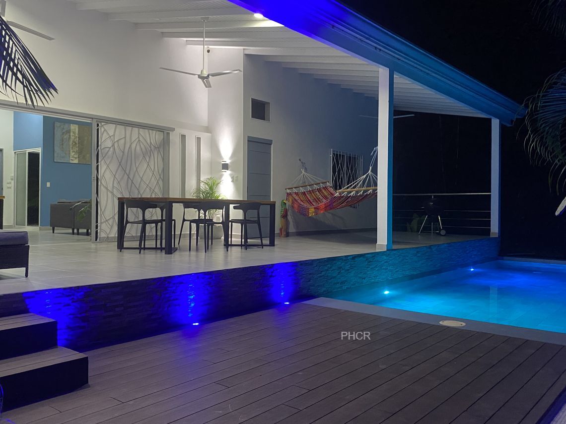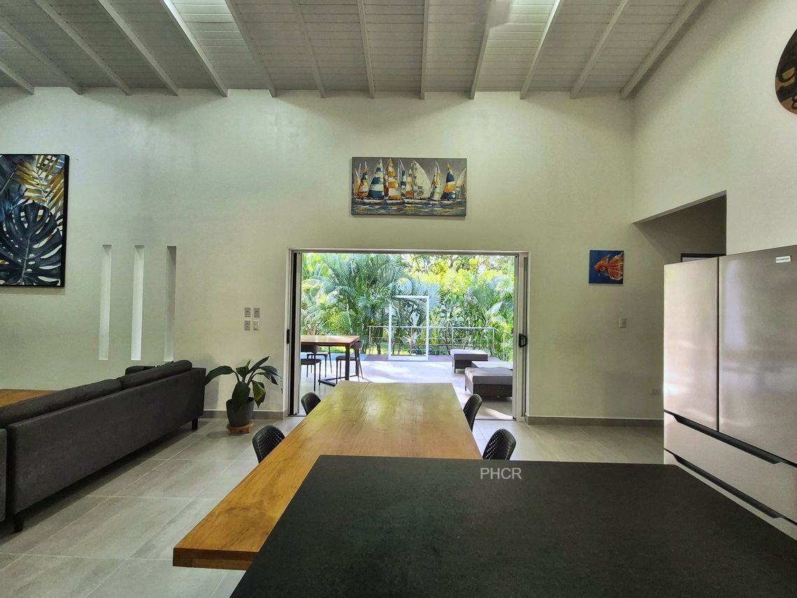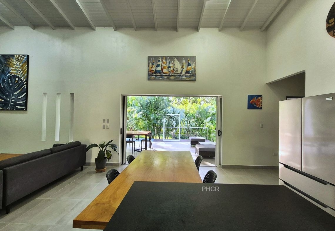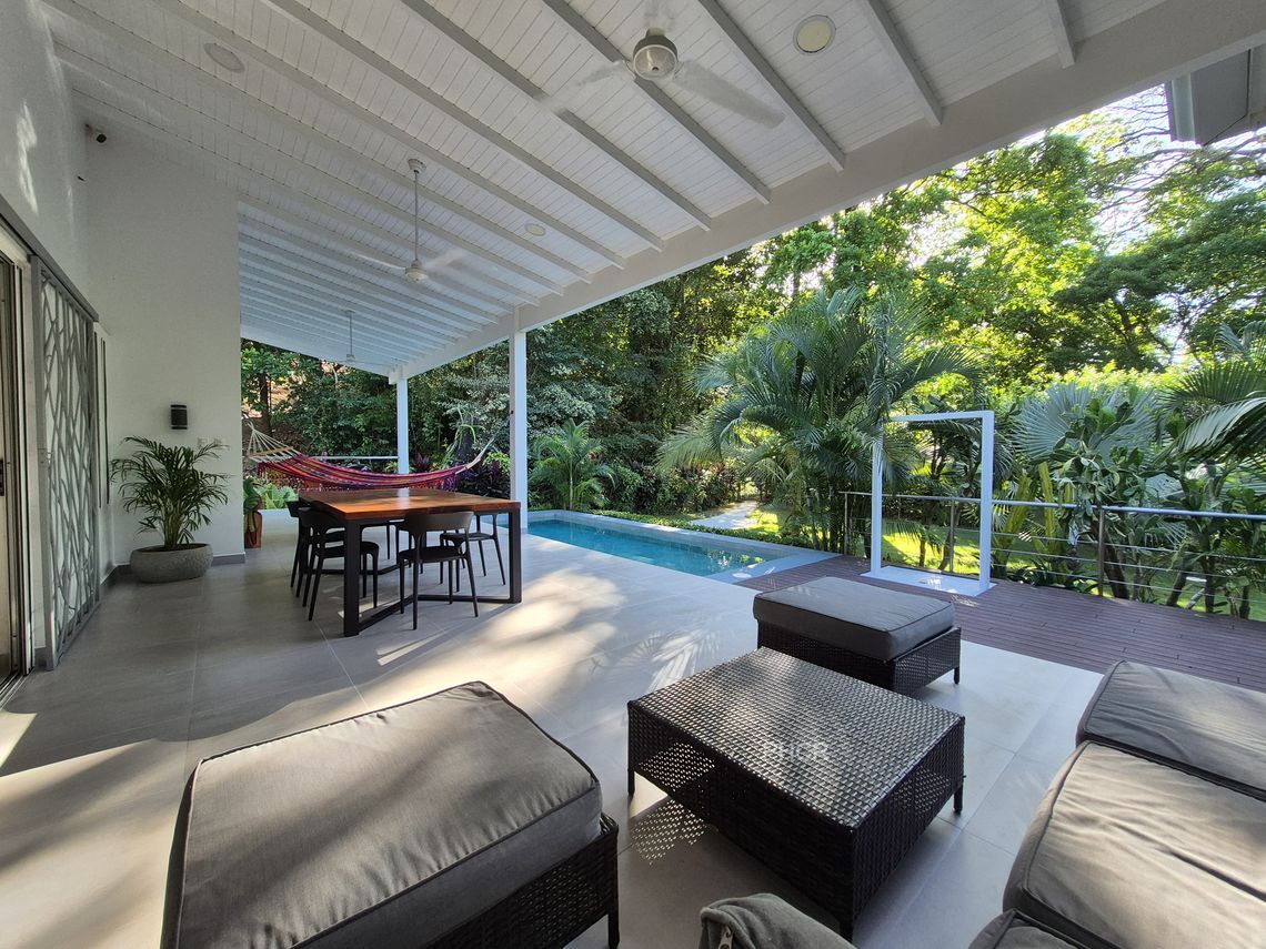Conçue comme un véritable espace de détente, la terrasse couverte invite à de longs repas en plein air et à des moments de relaxation avec vue sur le jardin. La piscine et la terrasse se fondent harmonieusement dans le paysage tropical qui descend jusqu’à la rivière Buena Vista, garantissant une intimité absolue et la possibilité d’observer quotidiennement la faune locale.