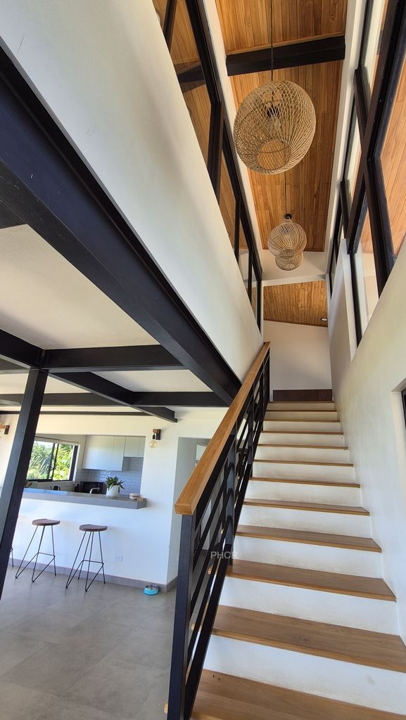 La maison se déploie sur deux niveaux avec un agencement fonctionnel et ouvert. Au rez-de-chaussée, les plafonds en teck à isolation thermique confèrent élégance et confort. Le vaste séjour comprend un salon, une salle à manger et une cuisine ouverte moderne haut de gamme équipée d’électroménagers en inox. Un bar permet de rester connecté tout en profitant d’une vue imprenable pendant la préparation des repas. Ce niveau comprend également une première chambre avec de grandes portes coulissantes en verre et une salle de bains privative, ainsi qu’une buanderie équipée d’un lave-linge et d’un sèche-linge.