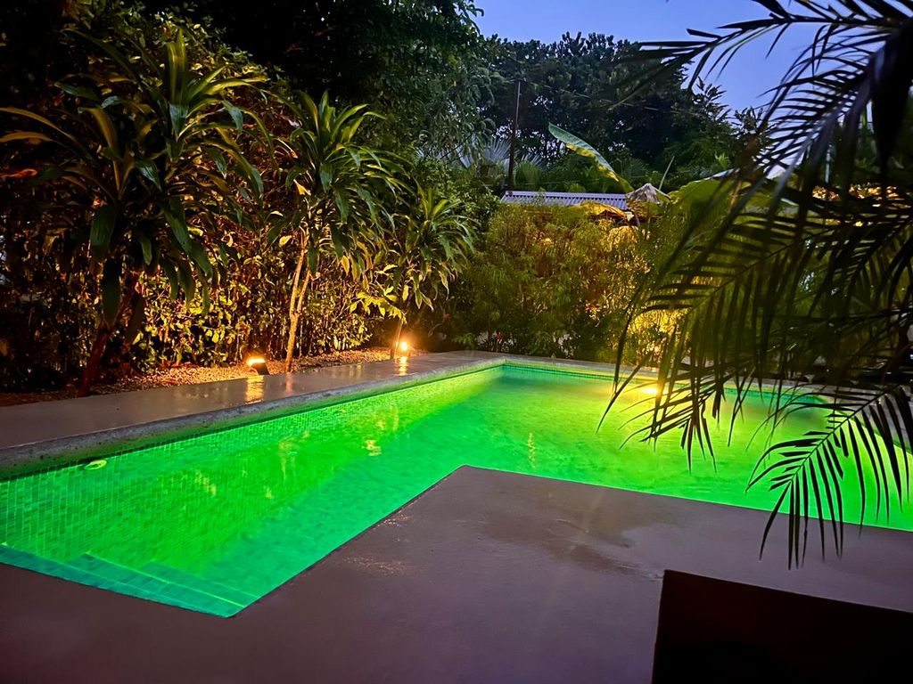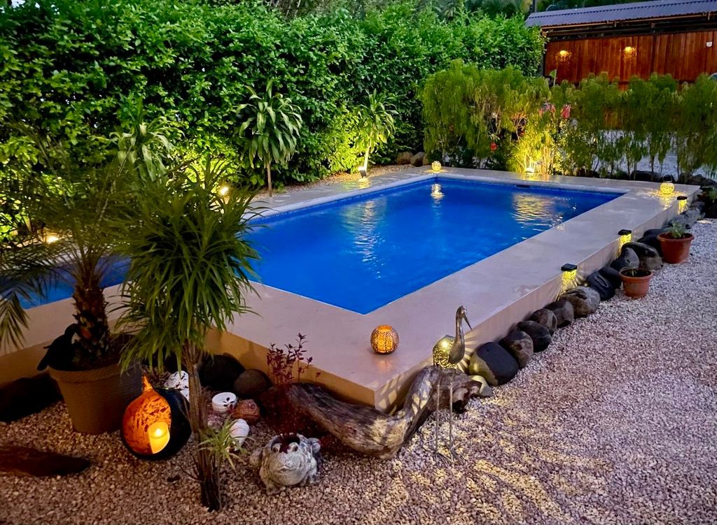 The fully fenced, easy-to-maintain garden surrounds the house with lush tropical plants and fruit trees — banana, lemon, mango, orange, and avocado — creating a serene and refreshing atmosphere around the pool. A parking area provides space for a car and a quad.