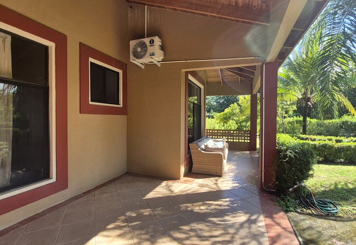 The house includes three bedrooms and two bathrooms. The master suite comes with a queen-size bed, a spacious wardrobe, and a private bathroom. The two additional bedrooms share a bathroom and are perfectly suited for children or guests. One is currently used as an office room with a murphy bed. Ceiling fans and air conditioning throughout ensure year-round comfort.